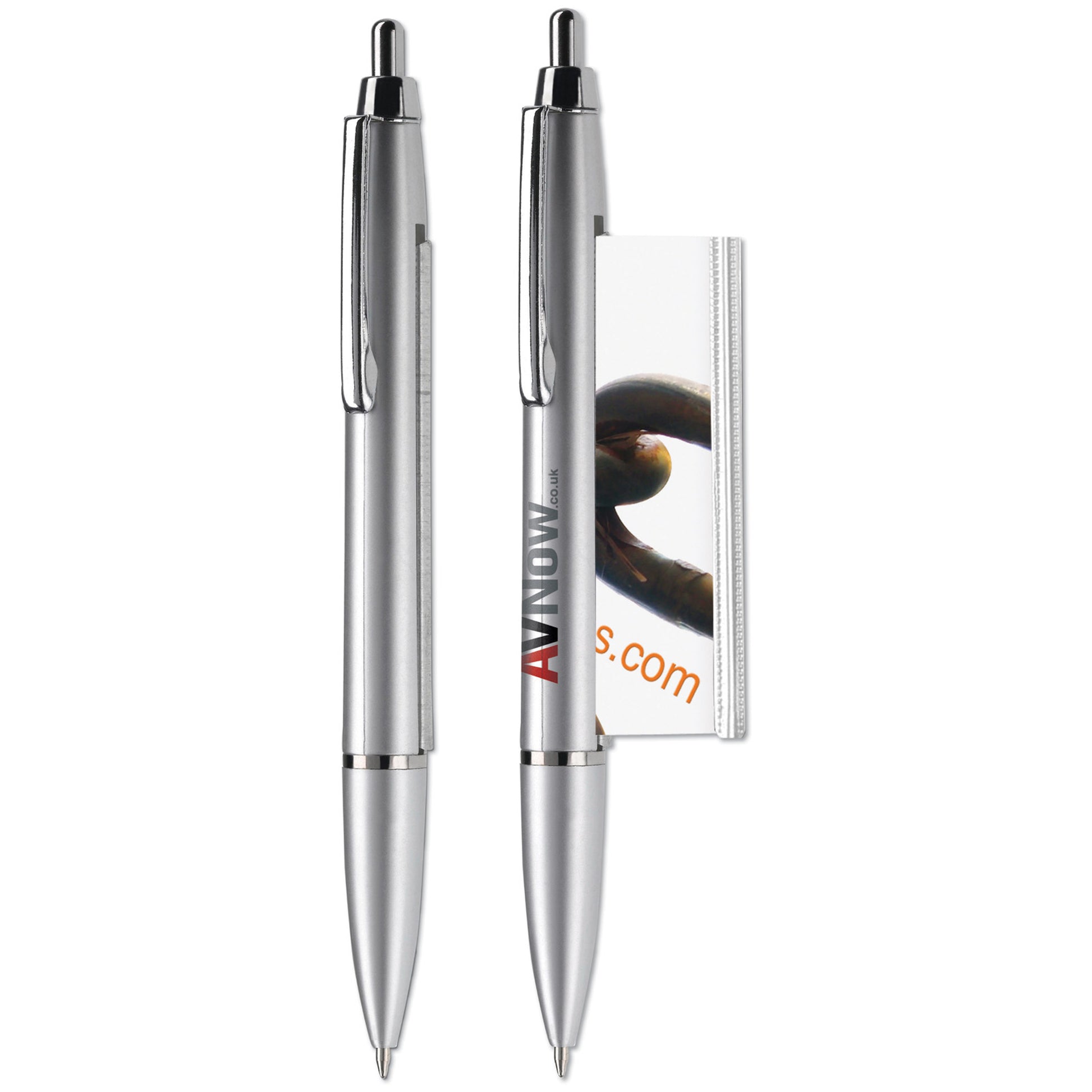 Silberfarbener Metall-Kugelschreiber. Vollfarbdruck auf beiden Seiten des Banners möglich. Zusätzlich ist eine Bedruckung des Schaftes realisierbar.