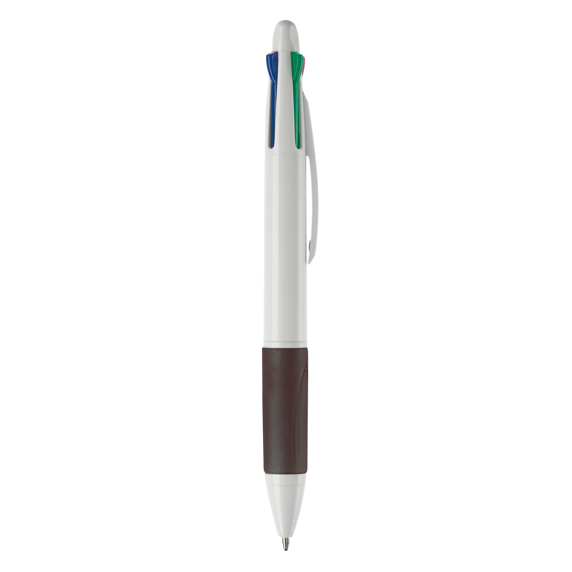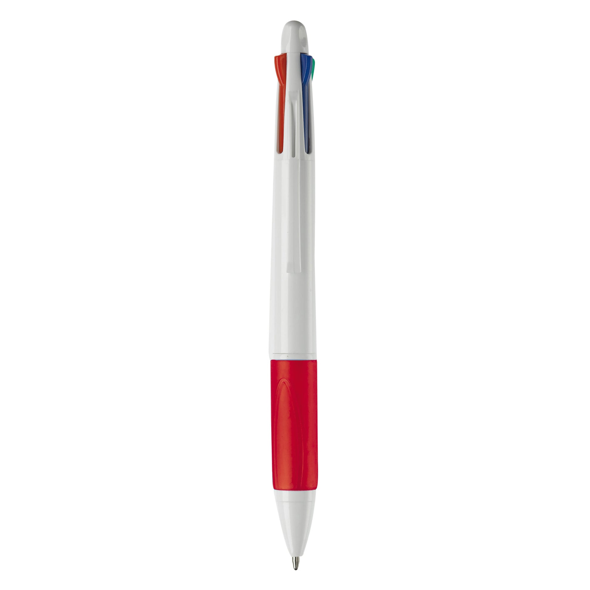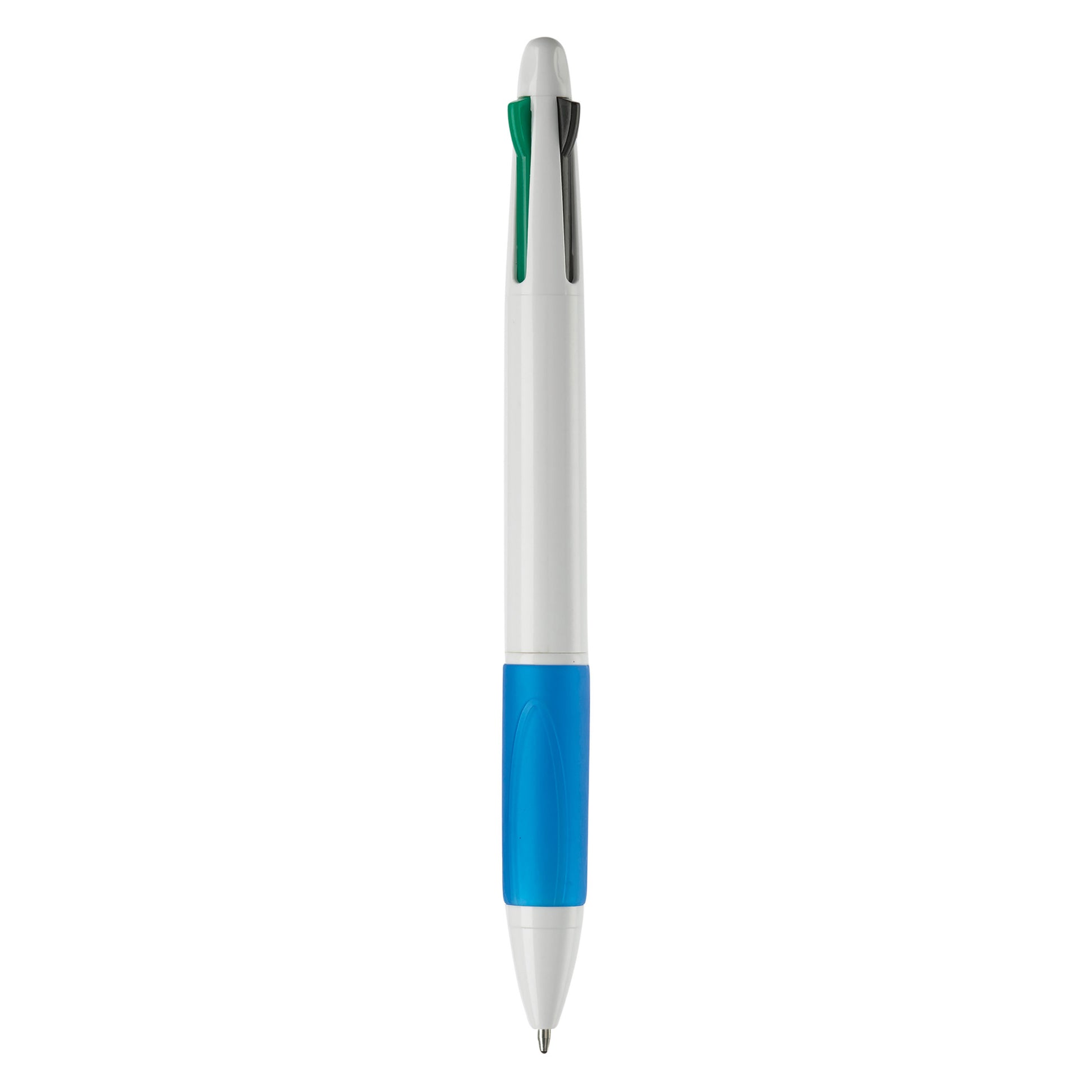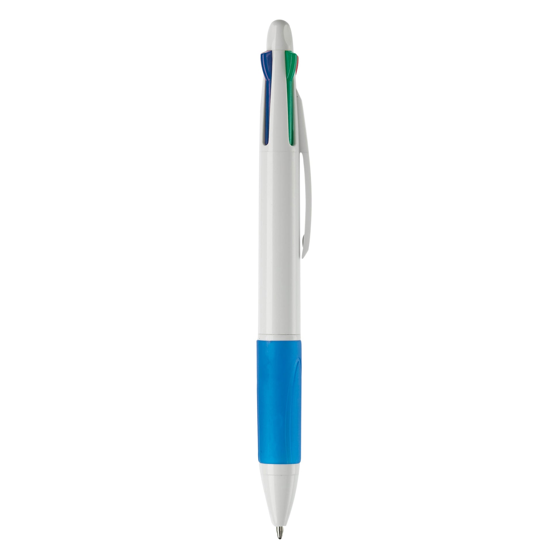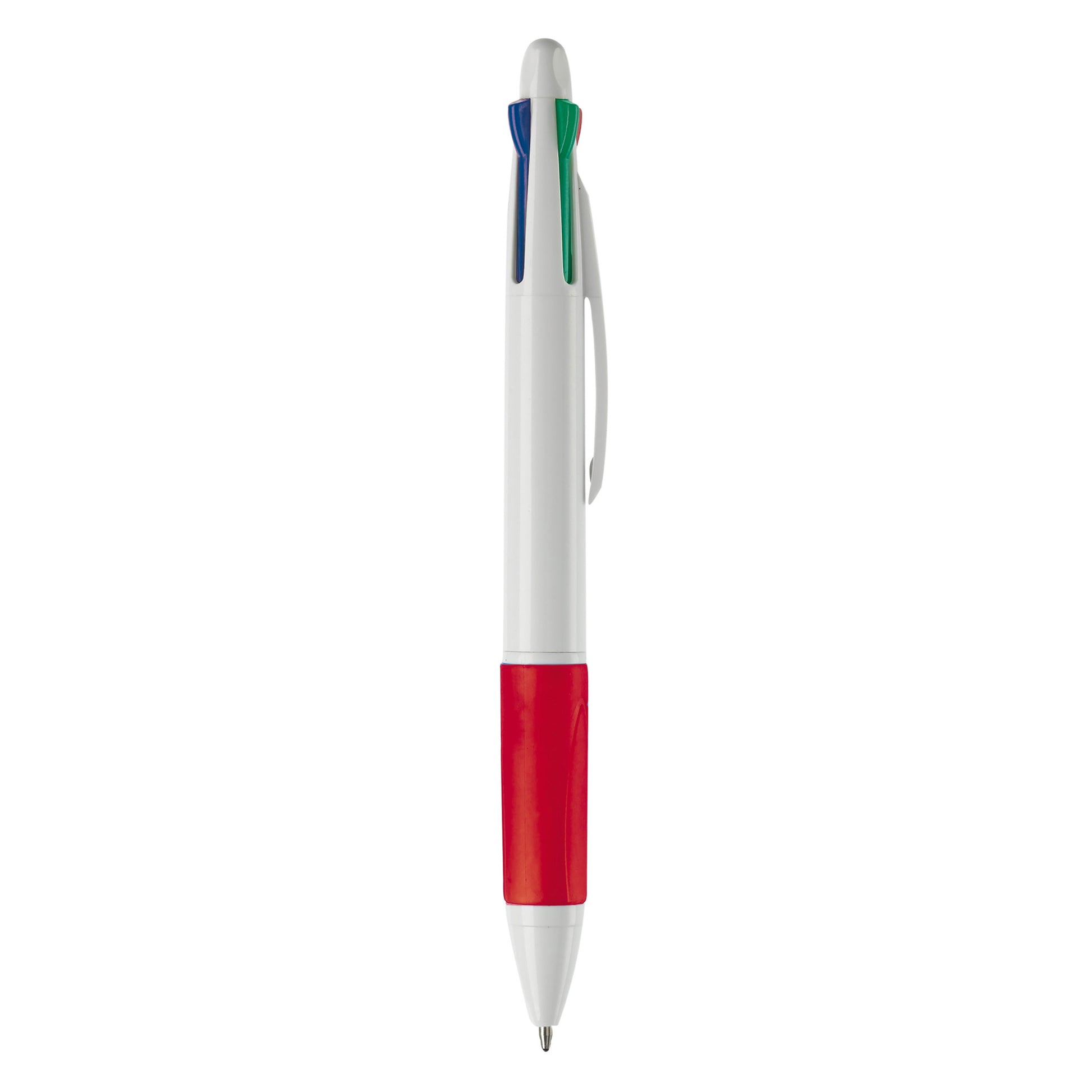 Weißer Hardcolour-Kugelschreiber mit vier Schreibfarben und farbigem Griff.