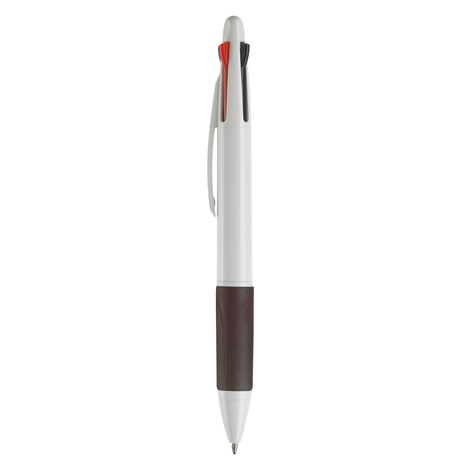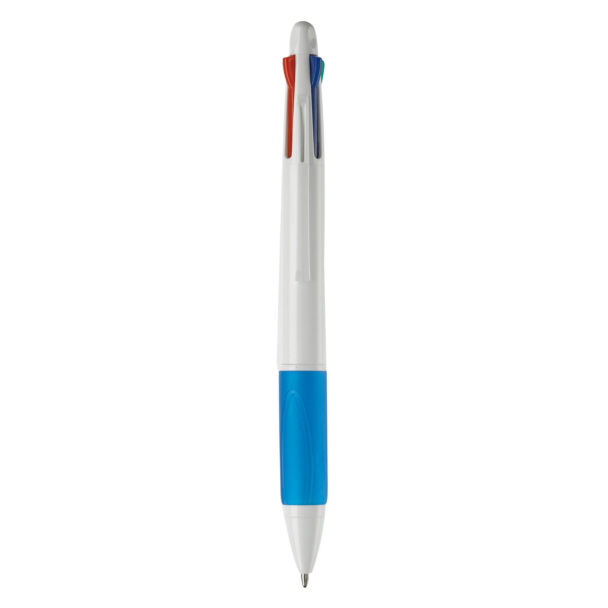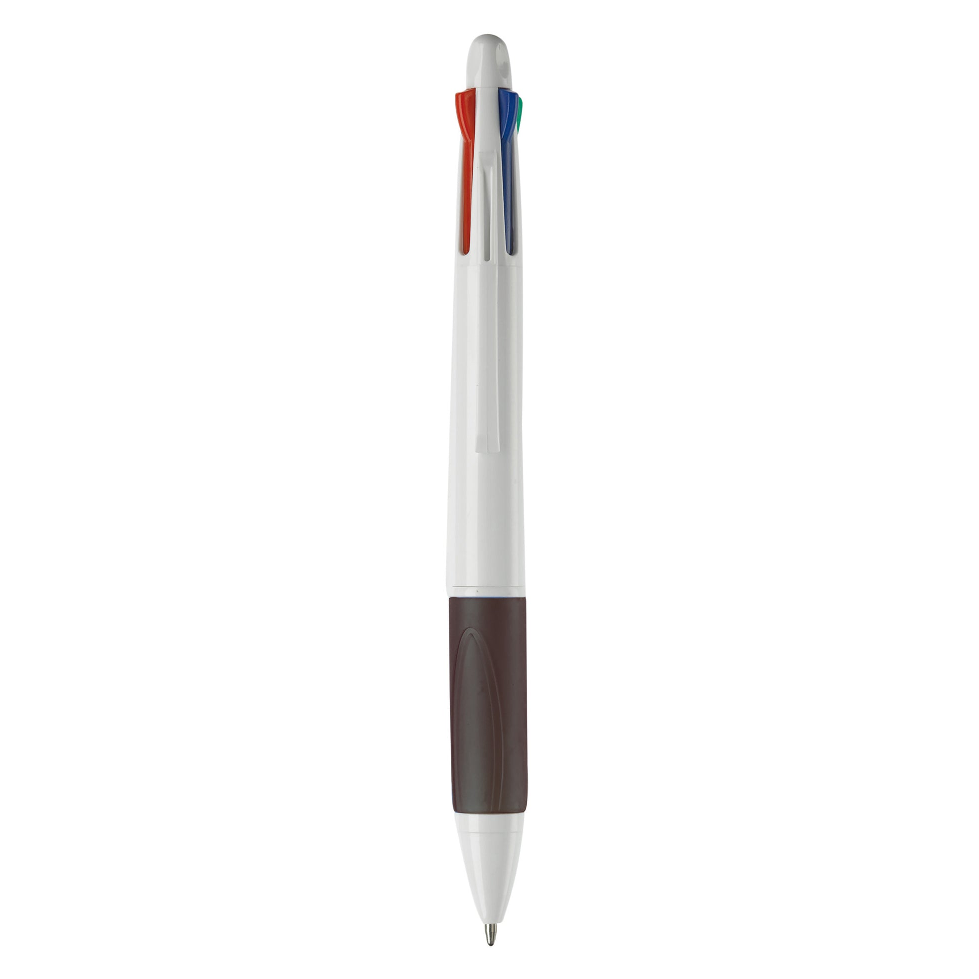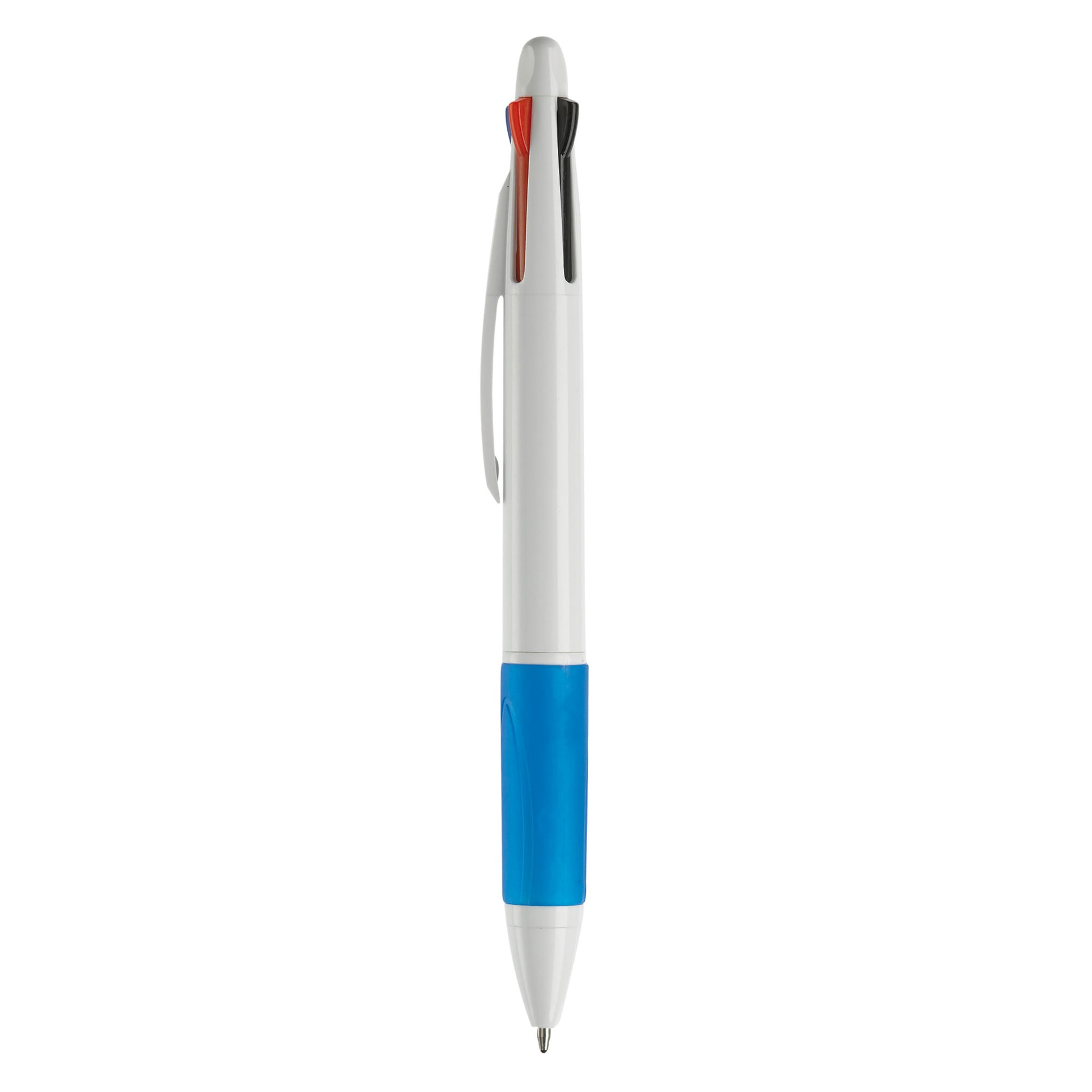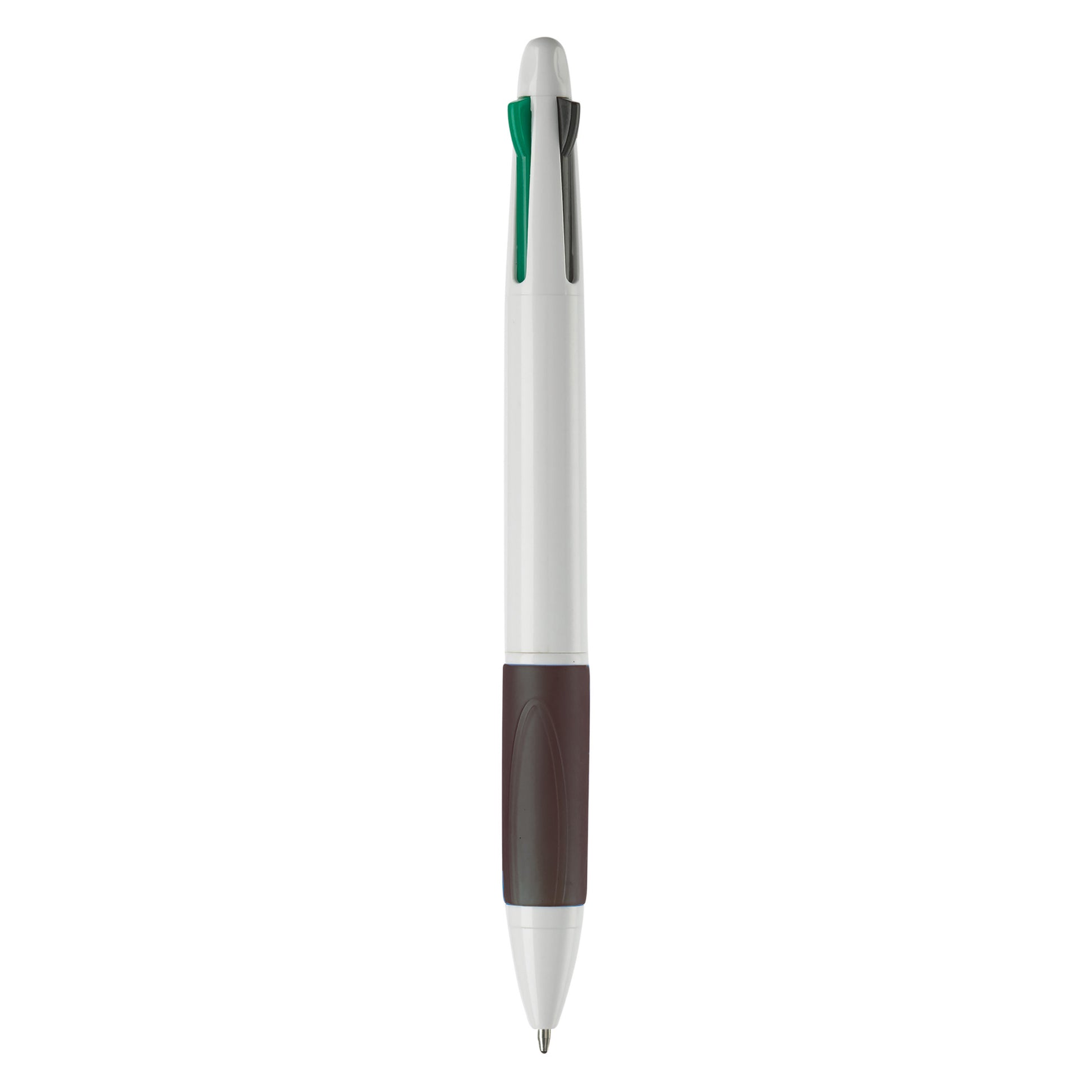 Weißer Hardcolour-Kugelschreiber mit vier Schreibfarben und farbigem Griff.