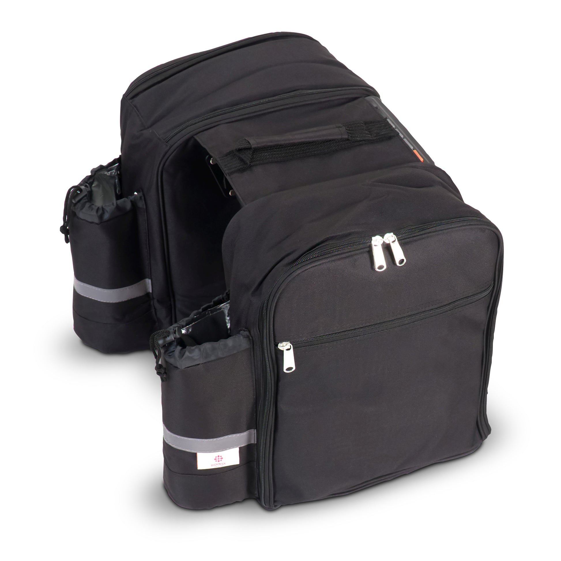 Geräumige Doppel-Picknick-Fahrradtasche mit umfangreichem Essgeschirr auf der einen Seite. Das Fach auf der anderen Seite ist mit Isoliermaterial gepolstert. Die isolierten Flaschenhalter haben reflektierende Streifen für zusätzliche Sicherheit. Dank der Universalhaken kann diese Tasche an vielen Arten von Gepäckträgern, einschließlich E-Bikes, befestigt werden.