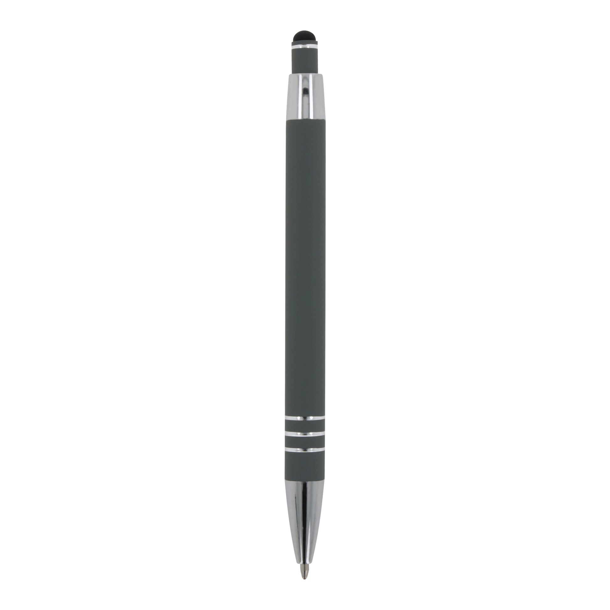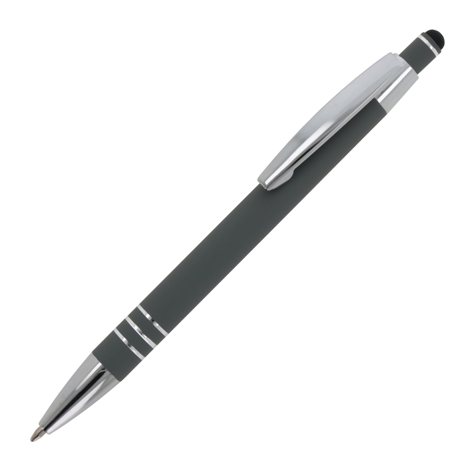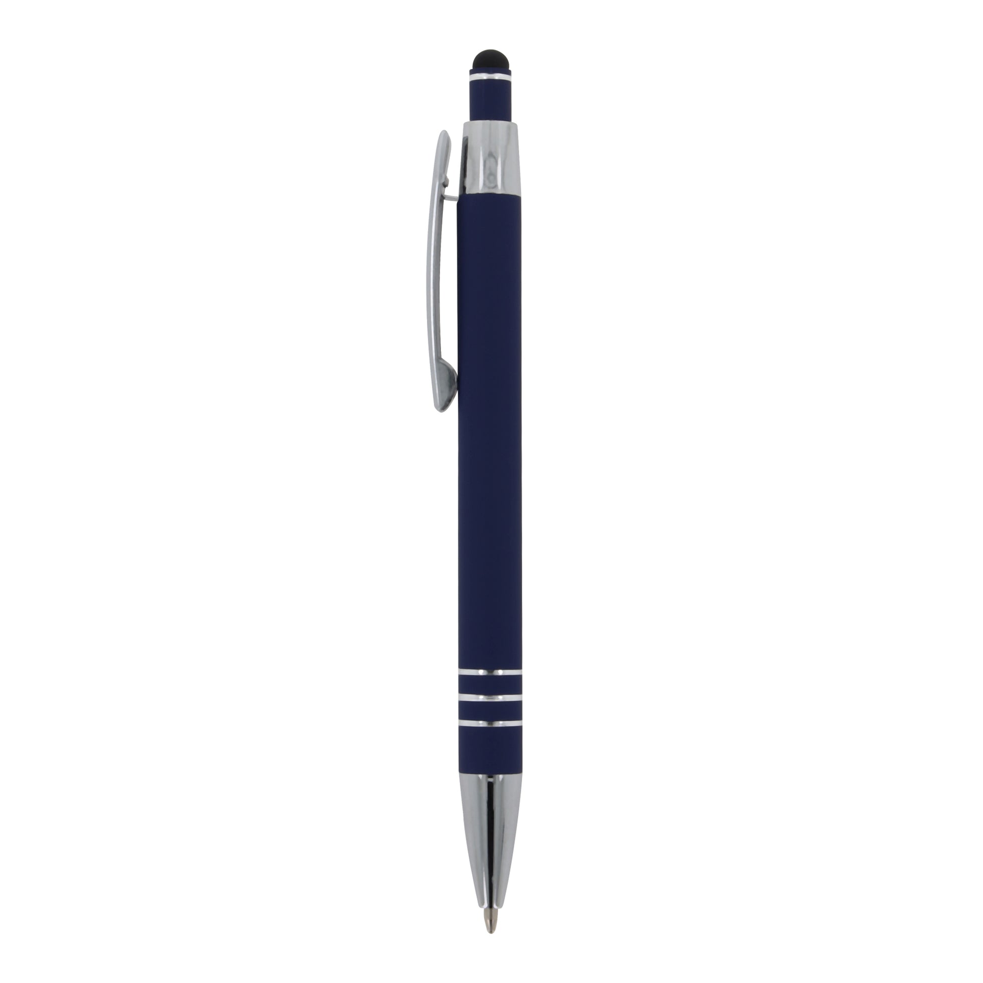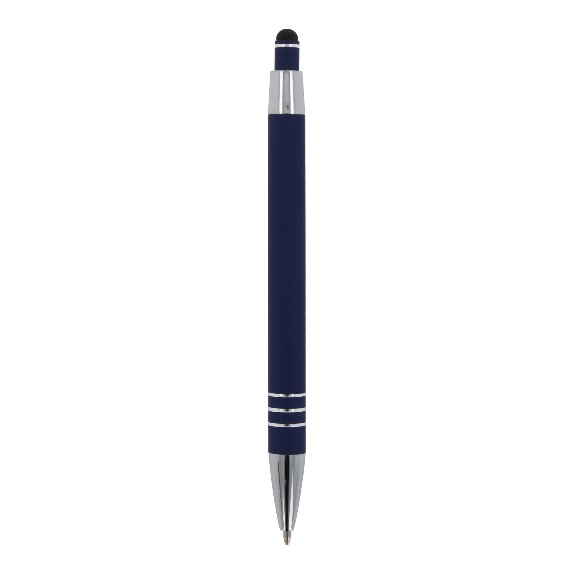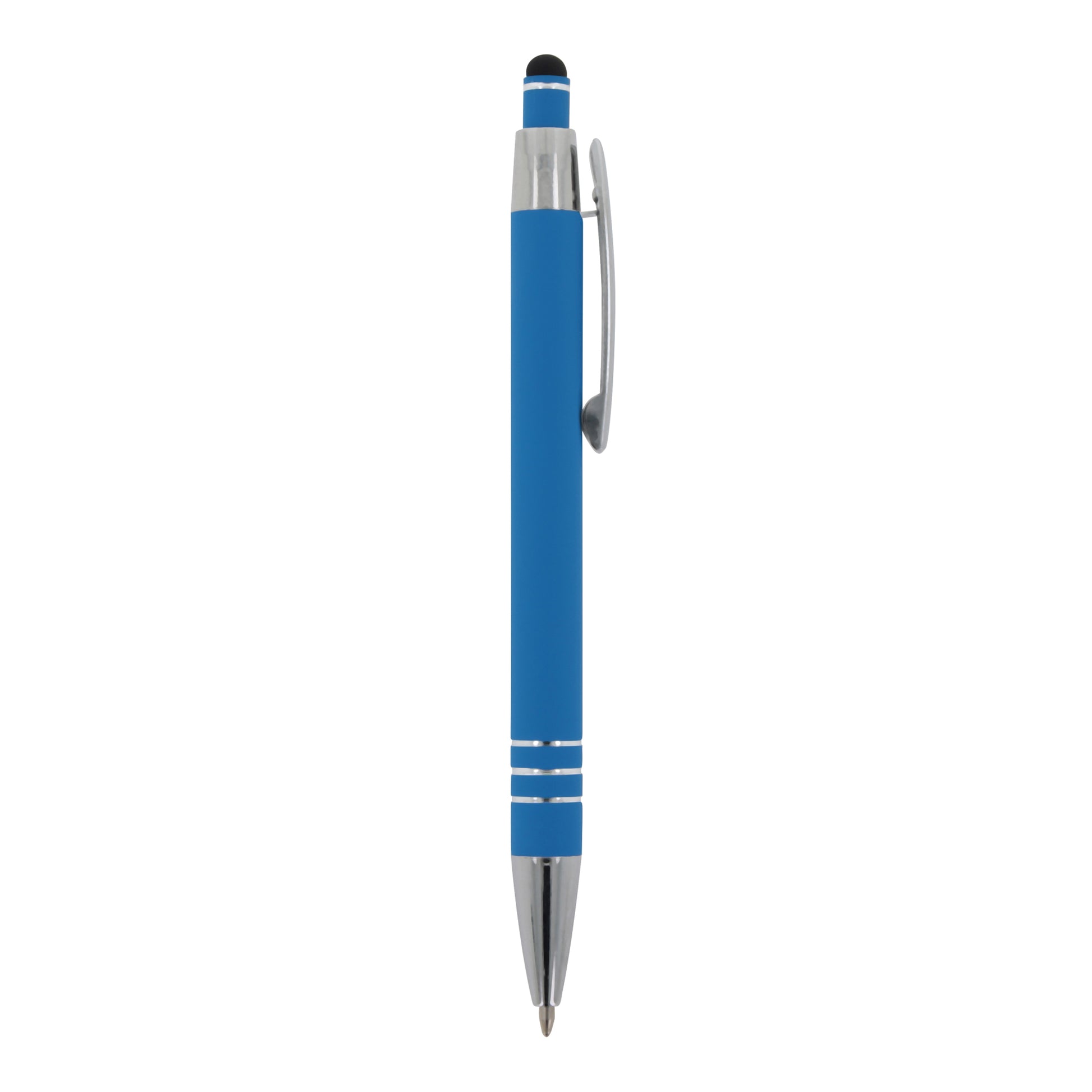 Kugelschreiber aus Aluminium mit eleganter Soft-Touch-Oberfläche und Stylus. Mit stabilem Metallclip. Schreibfarbe: Blau.