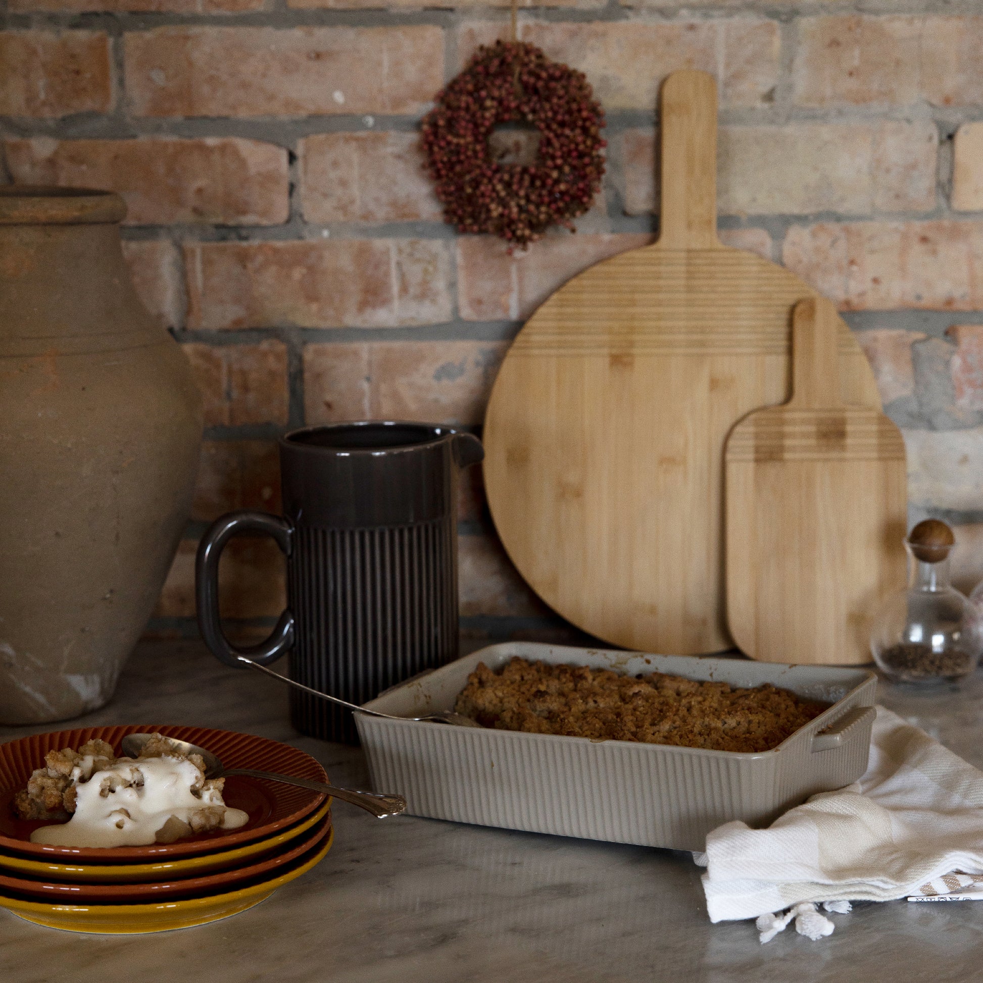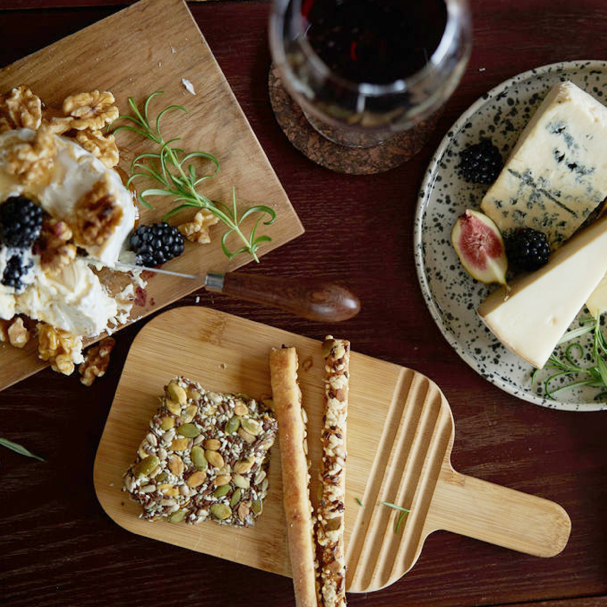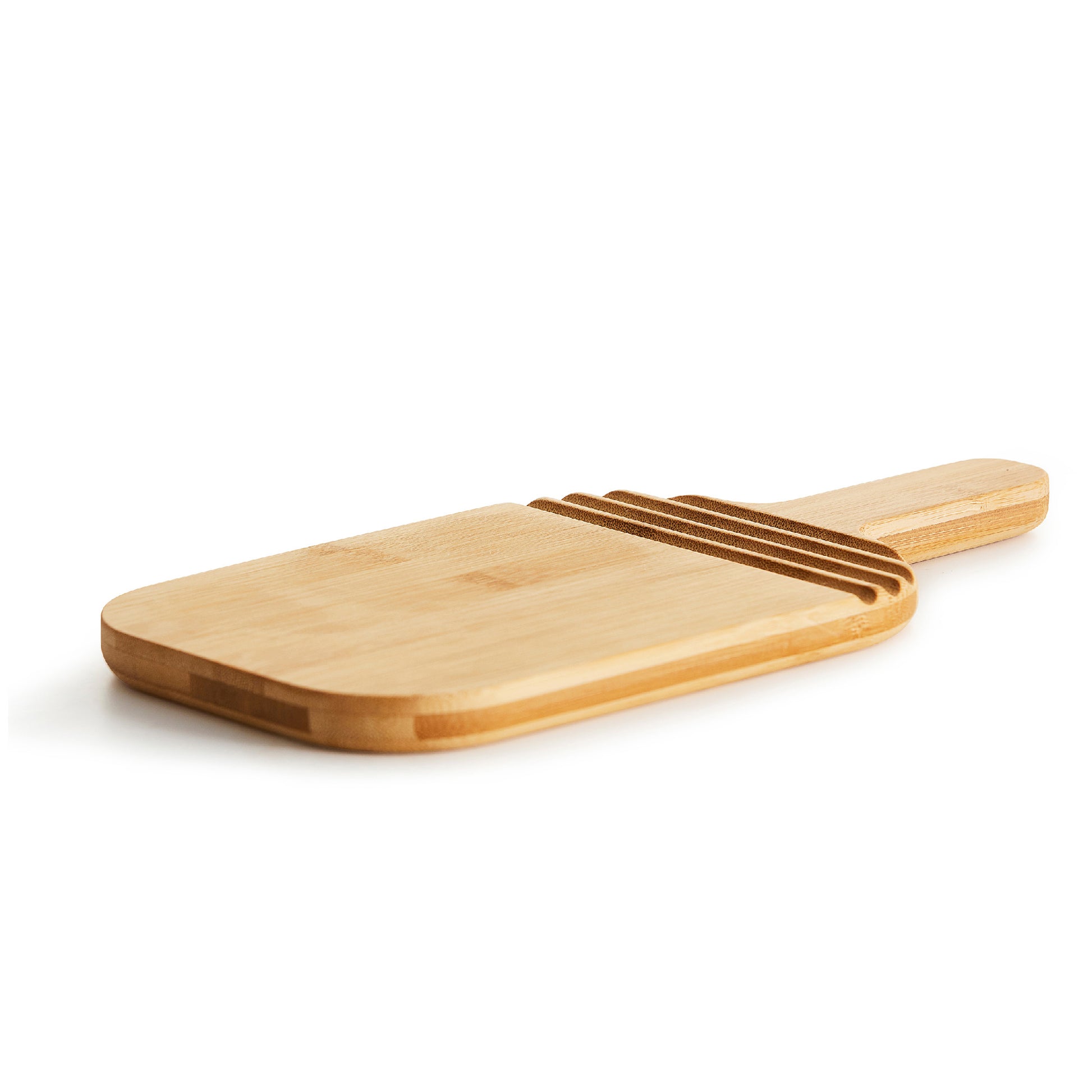 Zwei-in-einem Servier- und Schneidebrett aus Bambus in kleinem Format. Das Brett wurde von Anton Björsing entworfen. Zu den Designmerkmalen gehören ein stabiler Griff und Rillen, die optischen Stil und Funktion miteinander verbinden. Die Rillen bieten Platz für Utensilien, damit sie nicht abrutschen.