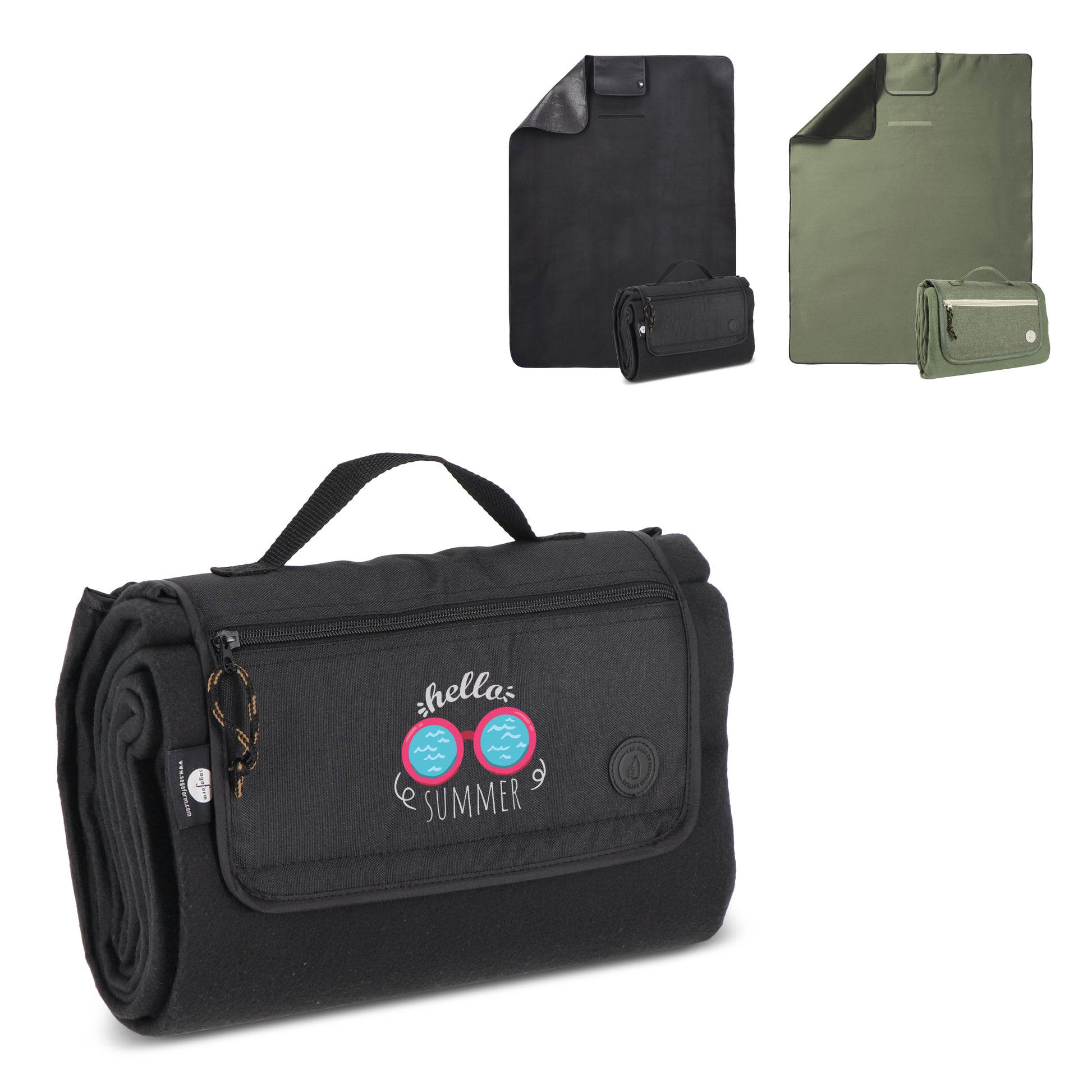 Luxuriöse und sportliche Picknickdecke mit einer wasserabweisenden Unterseite und einer Reißverschlusstasche zum Verstauen von Gegenständen. Erhältlich in grünem rPET-Material. Die Decke ist leicht aufzurollen und kann mit einem Griff getragen werden. Größe aufgeklappt: 165x128 cm.